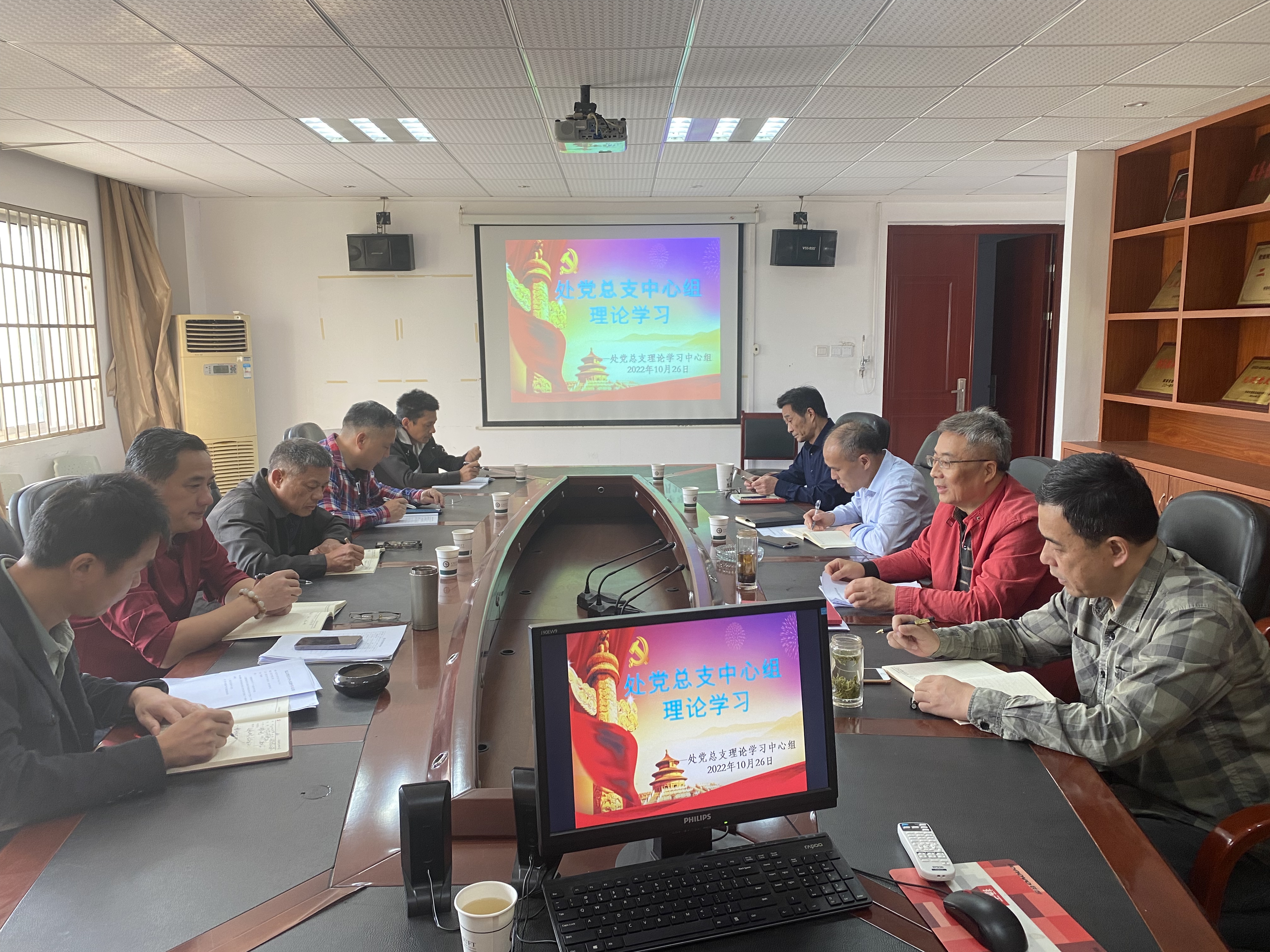 2022年10月26日上午,后勤管理处党总支理论学习中心组在共产党员之家开展集中学习。处总支书记胡建刚主持学习,中心组成员和各支部书记参加学习。