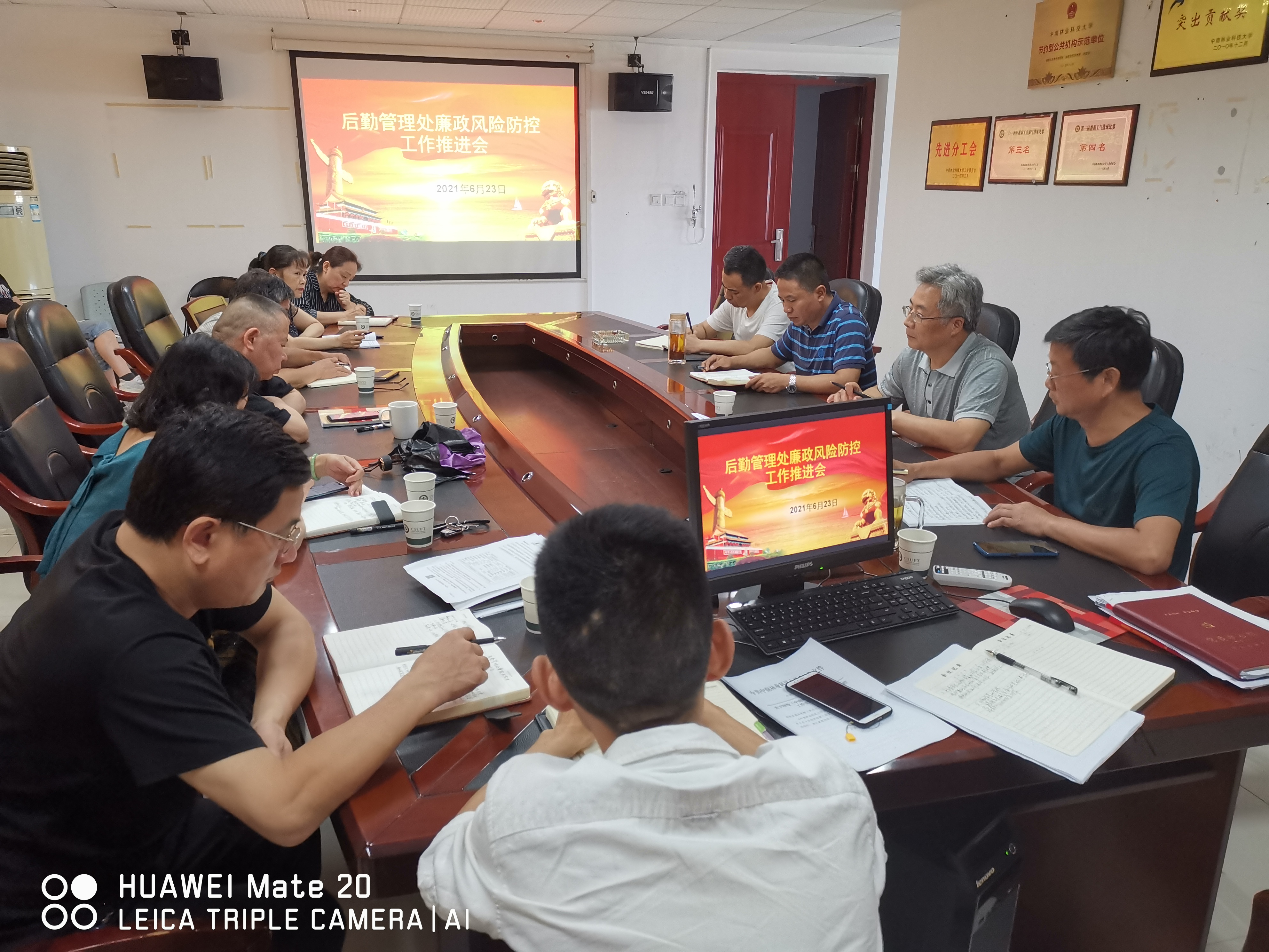 6月23日上午,后勤管理处在处会议室召开了廉政风险防控工作推进会。处总支书记胡建刚主持会议,处班子成员和各科室负责人参加会议。
